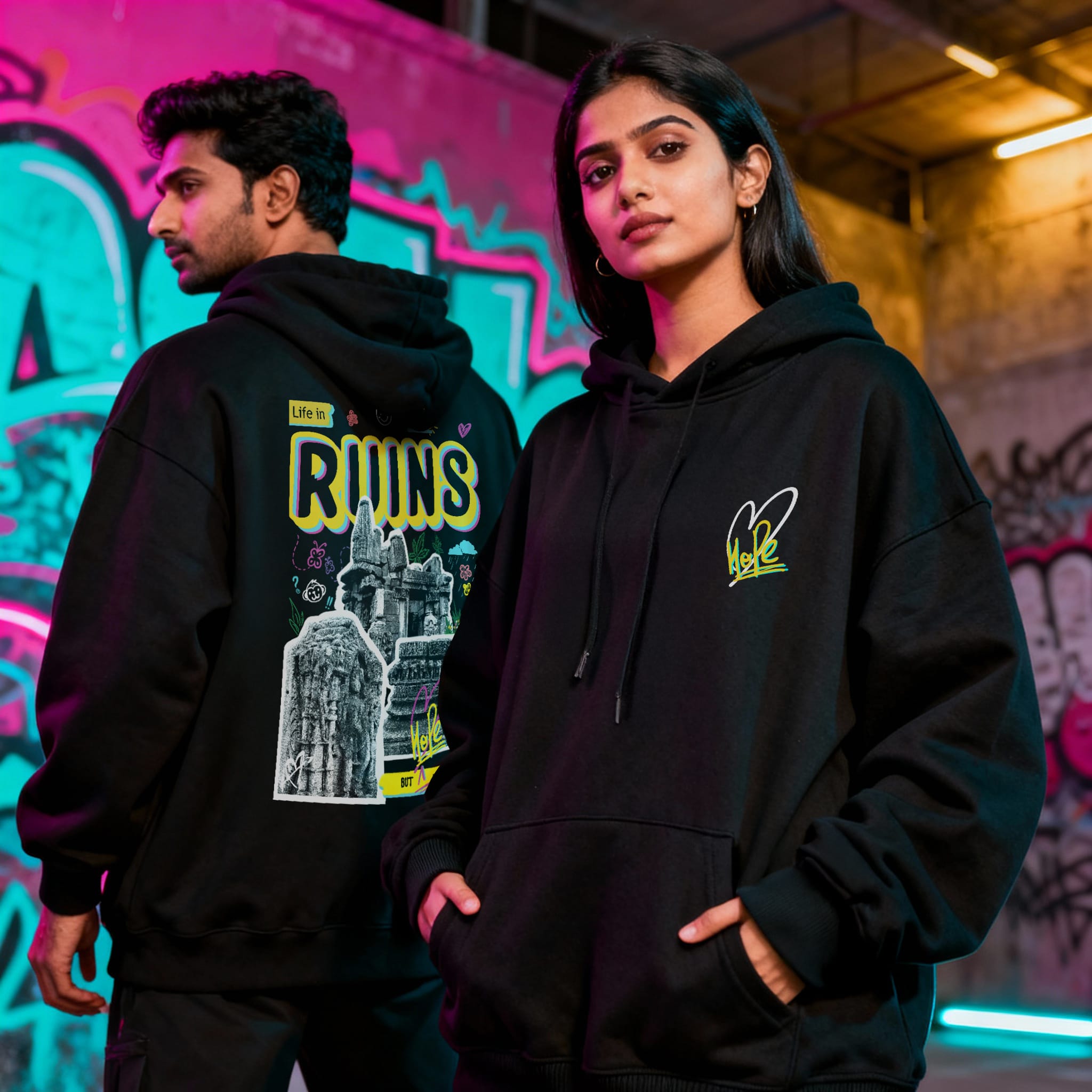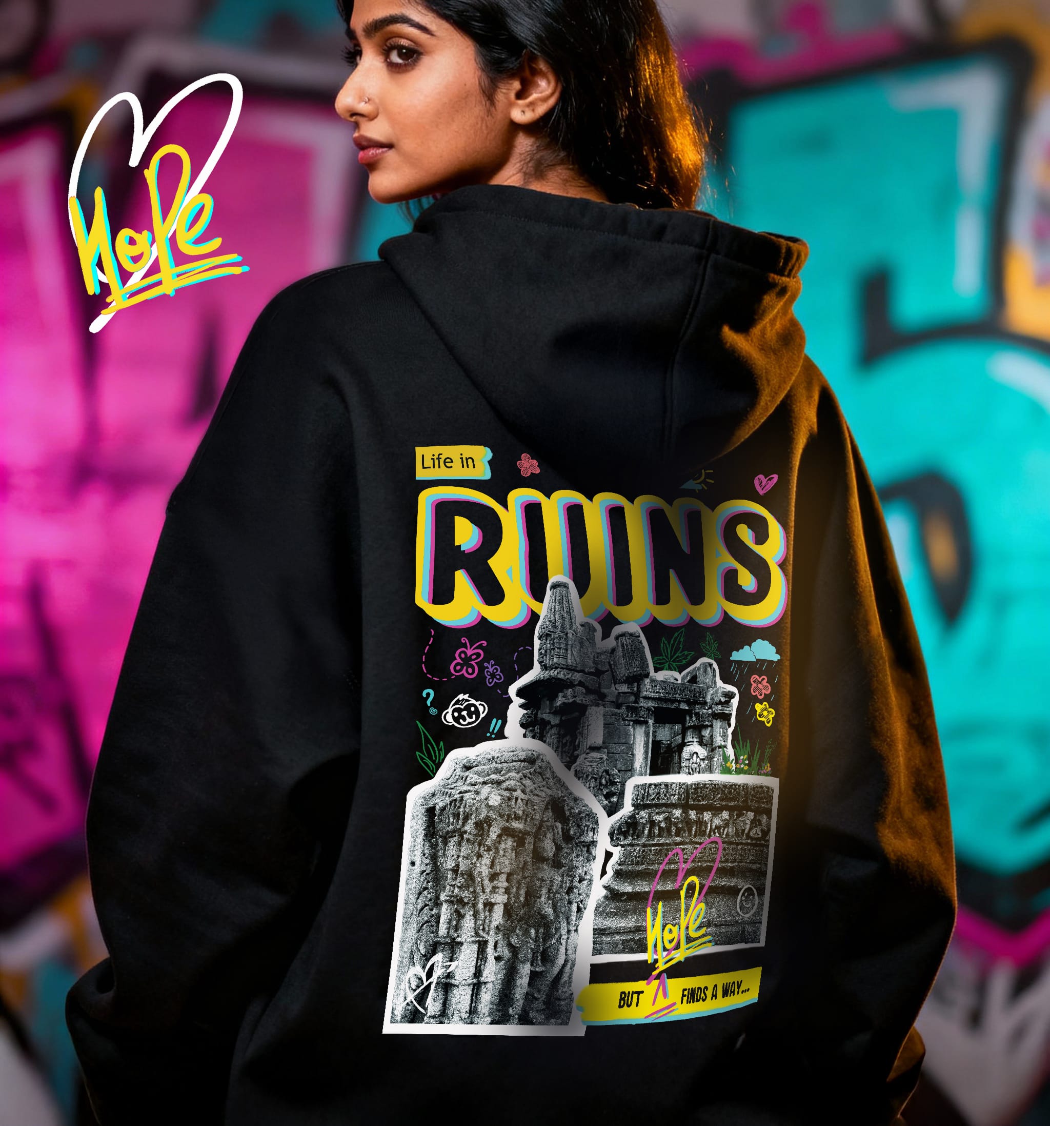 The Hope and Ruins Hoodie is a tribute to the quiet resilience that lives within ruins. Inspired by the ancient Katyuri dynasty temples of Uttarakhand, the back artwork blends sacred stone carvings with subtle graffiti-style doodles, a dialogue between the past and present, between what’s broken and what still breathes.