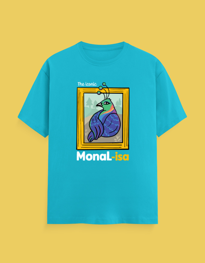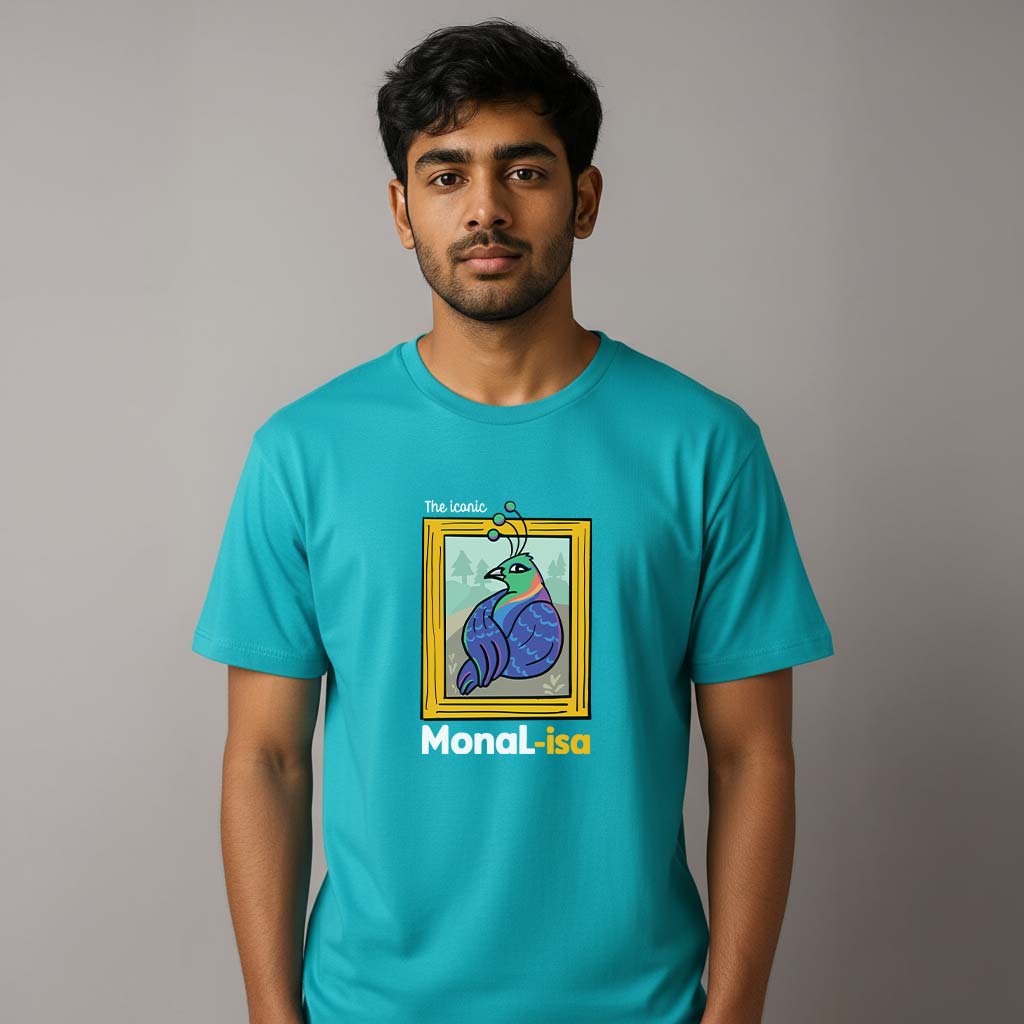 Step into the world of wearable art with The Iconic Monal-isa T-shirt – a creative fusion of culture, heritage, and imagination. Inspired by the Himalayan Monal, Uttarakhand’s iridescent state bird, and the enigmatic charm of Leonardo da Vinci’s Mona Lisa, this artwork celebrates beauty, mystery, and vibrance in one frame.