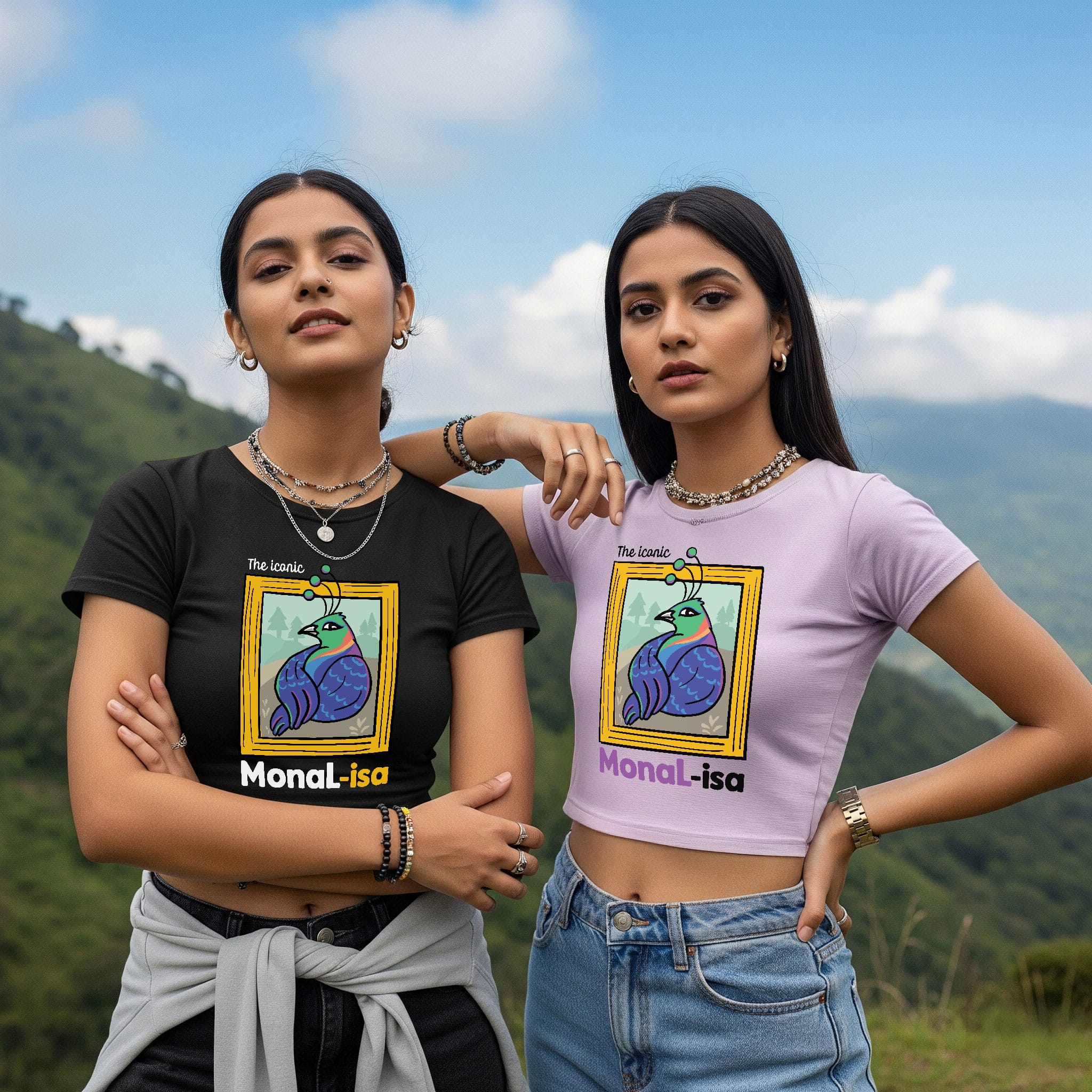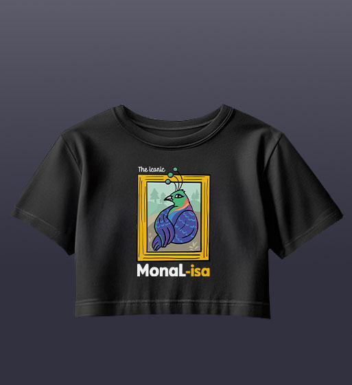 Our MonaL-isa crop top is where Himalayan charm meets artsy mischief. Crafted from 180gsm, 100% cotton fabric, it’s as breathable and comfy as it is head-turning. The design reimagines the iconic Mona Lisa with a playful twist, replacing her with the proud Himalayan Monal, Uttarakhand’s vibrant state bird. Pair it with jeans, skirts, or shorts, and you’ve got yourself a look that’s part fine art, part mountain magic, and fully conversation-worthy.