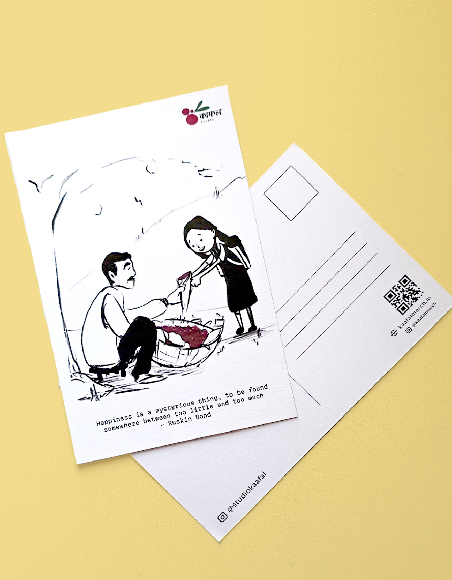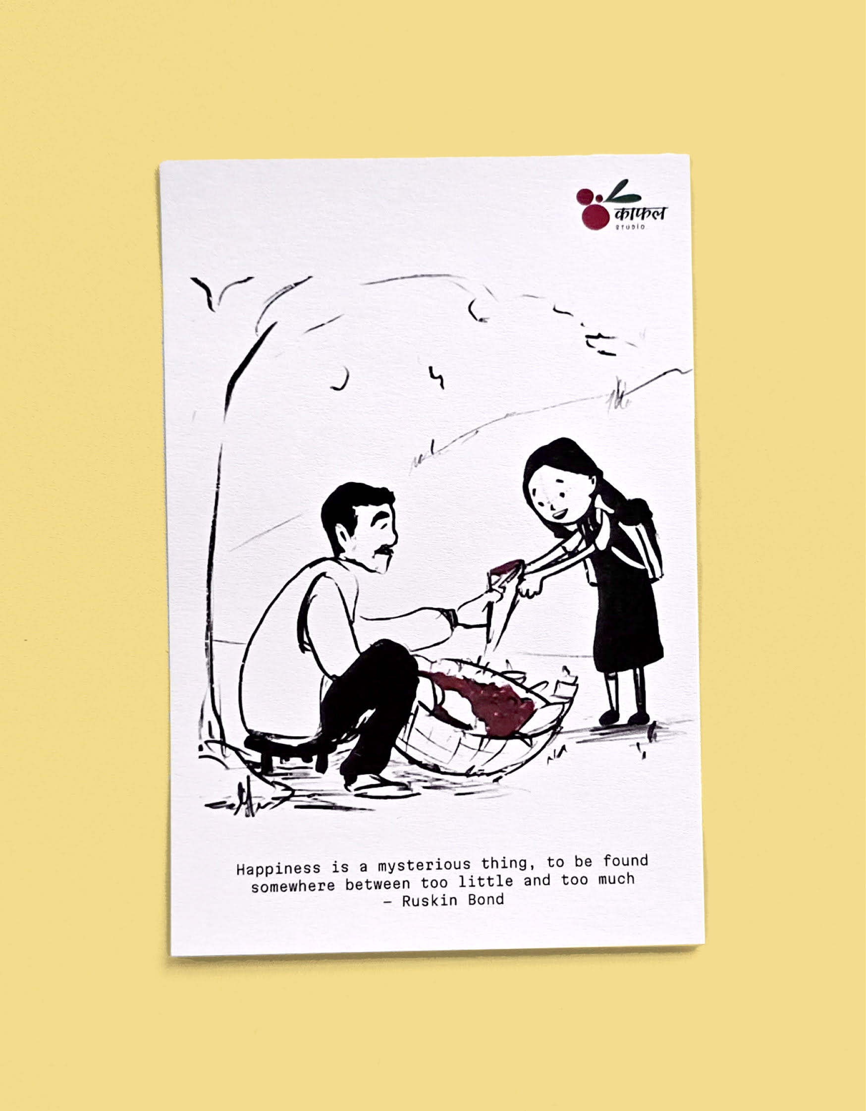 This hand-drawn digital illustration postcard brings back the charm of childhood through a scene of a kaafal seller, paper cones, and a basket filled with these beloved hill berries. It captures those small, joyful moments of khatta-meetha indulgence.