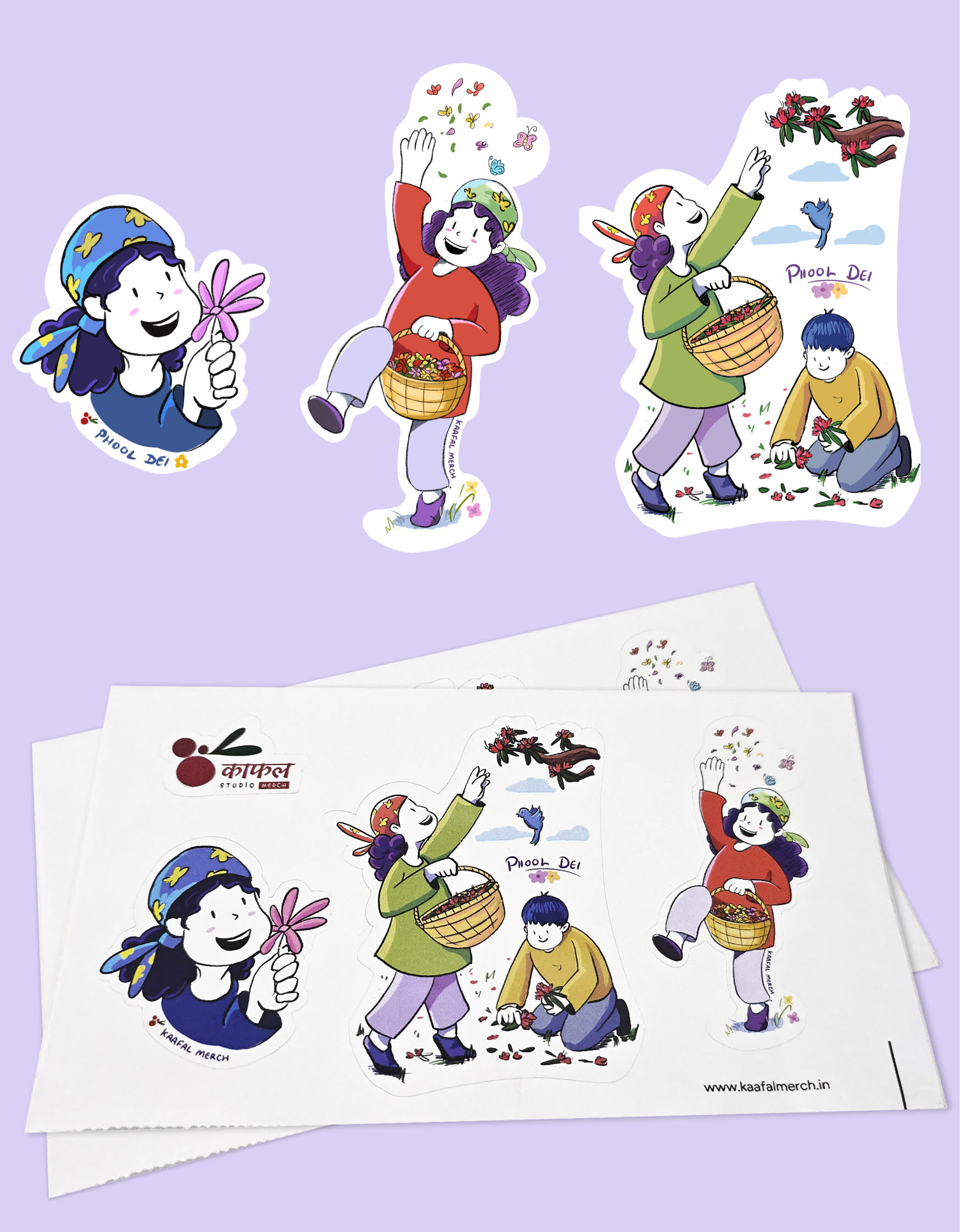 This set of 3 hand-illustrated stickers is inspired by the beauty of Phool Dei – a festival that welcomes spring with flowers, blessings, and joy. Designed with cute pahadi characters and festive details, each sticker carries a little piece of mountain warmth and nostalgia.