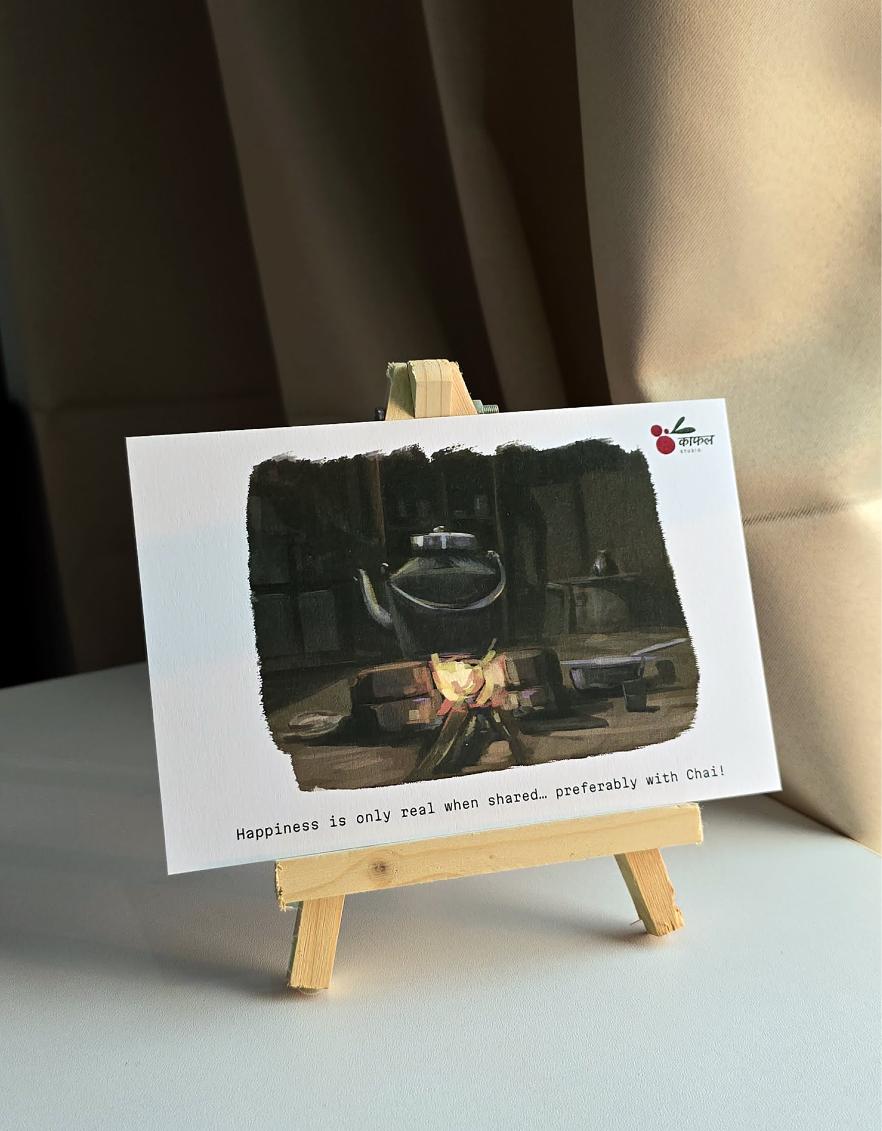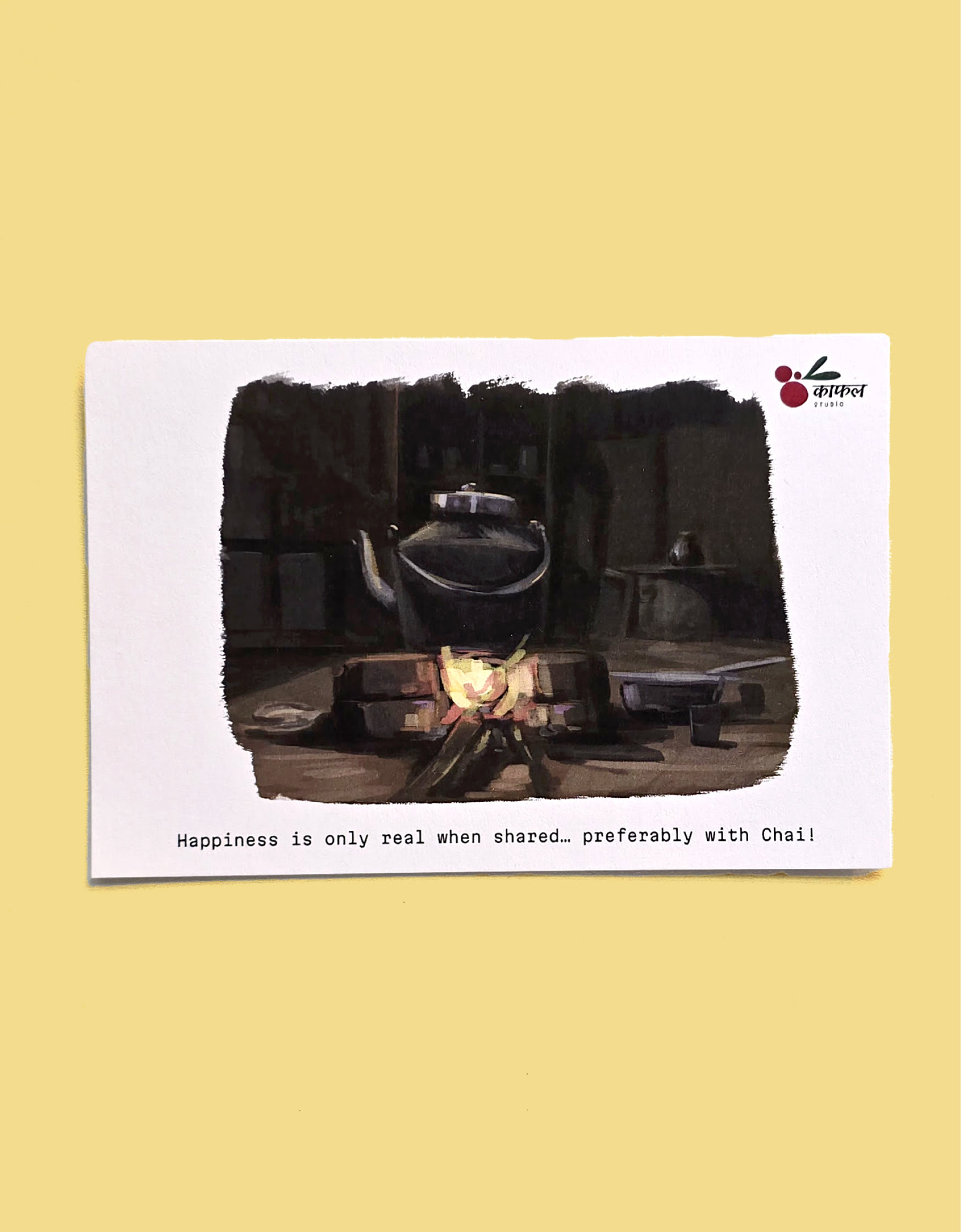 A hand-drawn illustration postcard inspired by peaceful mountain life, featuring a warm chulha, firewood, and chai brewing in a kettle.