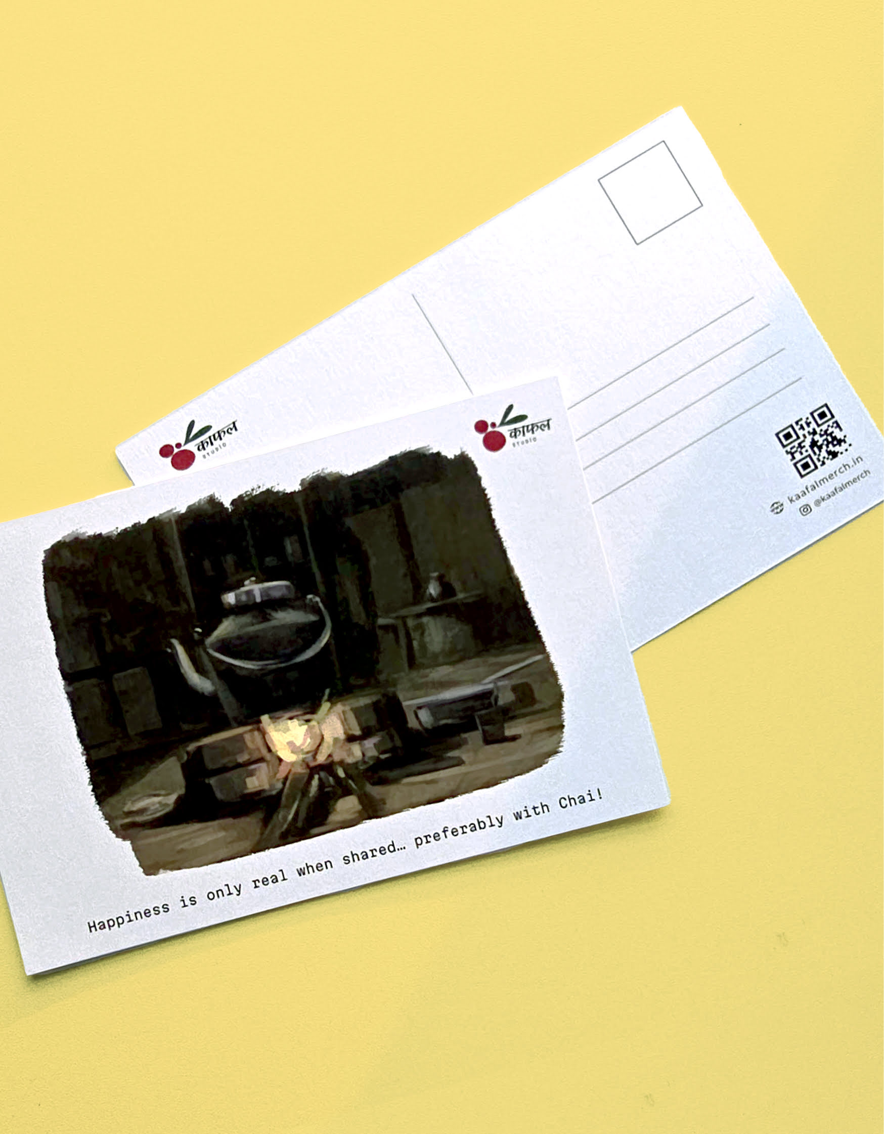 This hand-drawn digital illustration postcard brings to life a cozy village scene with a traditional chulha, firewood, and chai gently brewing – capturing its warmth and simplicity.