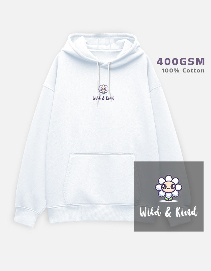 This oversized hoodie is a hug from the hills — where wild daisies bloom freely and kindness lingers in the air. Crafted from premium-quality 400GSM cotton, it features a centered, delicately embroidered daisy with wild and kind stitched right below, a quiet reminder to stay soft in a loud world. With its drop shoulders, roomy fit, and cozy weight, this hoodie is made for slow days, stargazing nights, and everything in between. Comfort meets meaning in every thread.